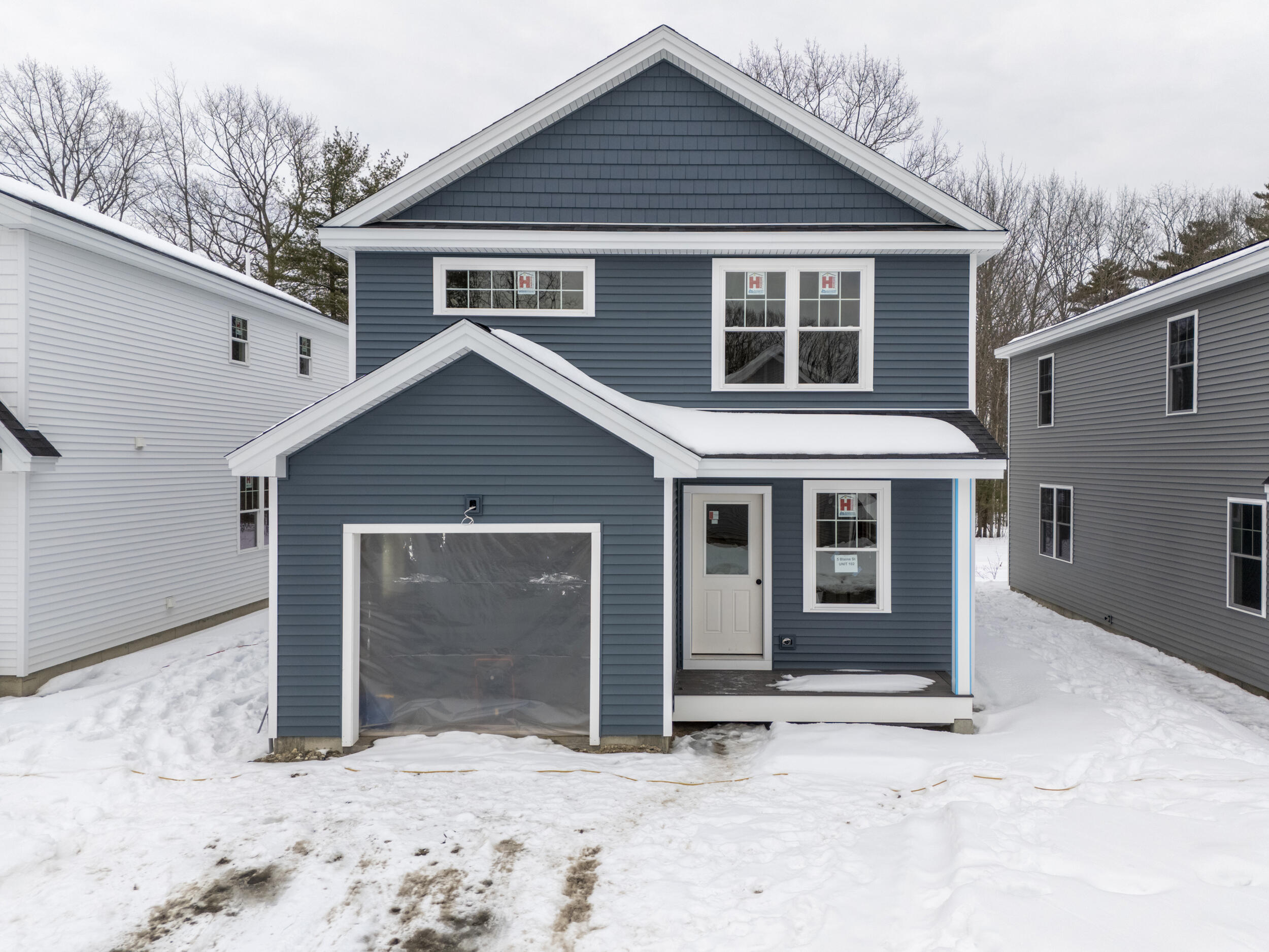 Framing has begun! First units ready for closing by end of January 2026. Dogs welcomed at these detached condos located directly on the Eastern Trail !! Secluded setting off a dead end street, that's close to Shopping, Turnpike Exit, and Thornton Academy. Healthy, energy efficient, new construction with full sprinkler system, energy recovery ventilators for fresh air, full radon system, and full blower test to reduce energy consumption from air leakage. Heat pumps for cooling and heat. First floor has an exterior front porch; entry area w/closet; open KIT/DN//LV with hardwood floors and appliances; separate laundry room; guest bathroom; rear sundeck and attached 1-car garage. Upstairs has a huge primary BR w/en suite bathroom and walk-in closet; 2 good sized BRs; and another full bathroom. Low condo fees of 140! All units have full basements with varying ceiling heights for storage, so call now to get one with full basement height! Blaine St is a new street, not in GPS. GPS 47 Roebuck Avenue Saco ME. These units are in SACO. If your GPS takes you to Old Orchard or Ocean Park, you are in the wrong location.